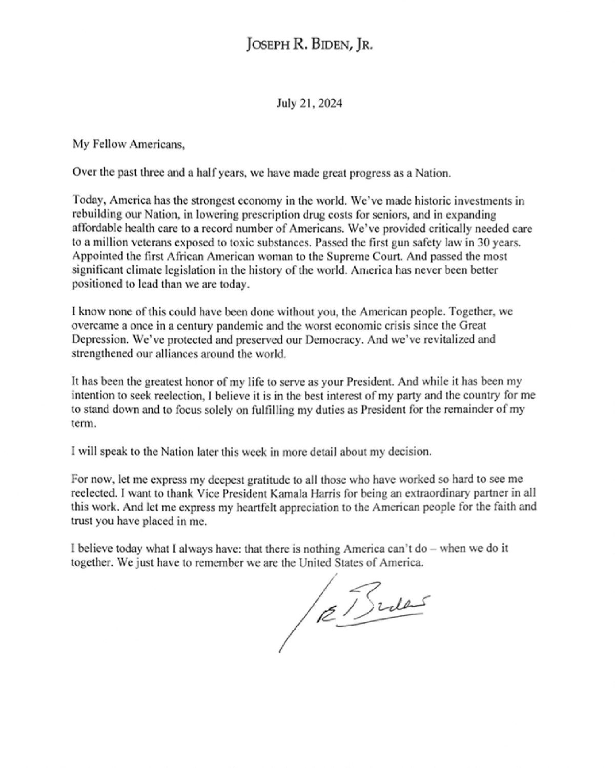 "It has been the greatest honor of my life to serve as your President. And while it has been my intention to seek reelection, I believe it is in the best interest of my party and the country for me to stand down and to focus solely on fulfilling my duties as President for the remainder of my term," Biden wrote.