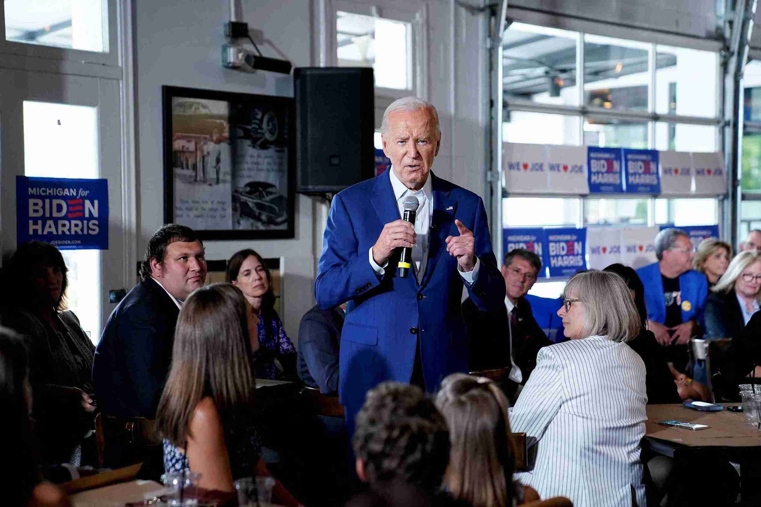 Joe Biden speaks as he visits Garage Grill and Fuel Bar in Michigan. / Reuters/Elizabeth Frantz