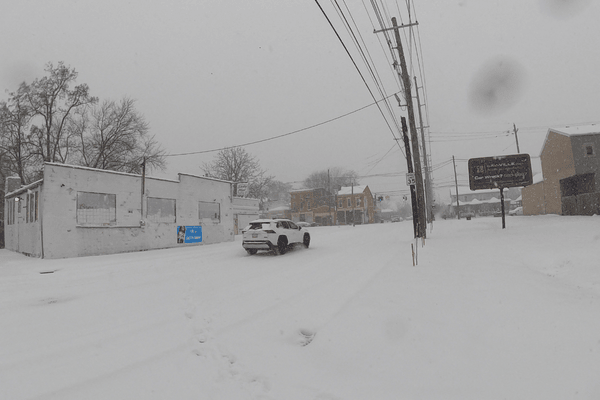 A car drives through the snow as it covers streets in Louisville, Kentucky, U.S., January 5, 2025, in this screen grab obtained from a social media video. / Richard Stottman/@cyntrix/via REUTERS/File Photo