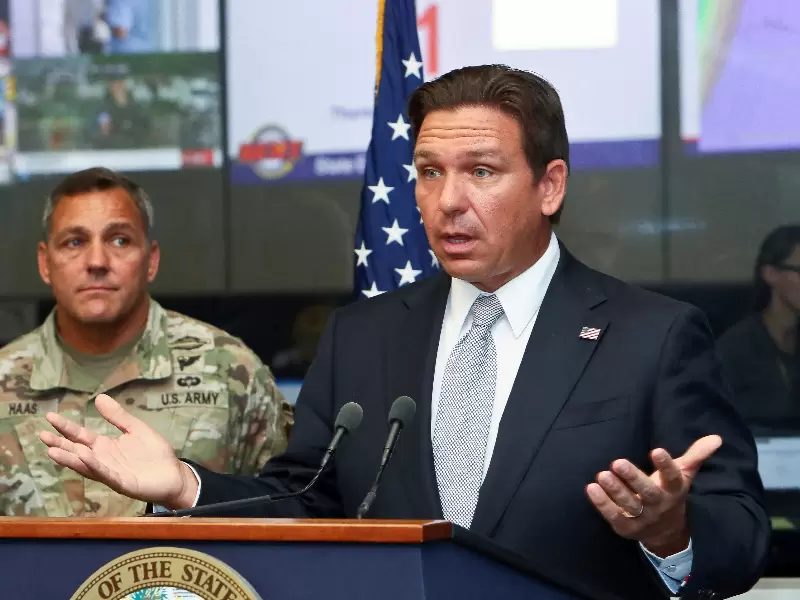 FILE PHOTO: Florida Governor Ron DeSantis speaks about Hurricane Helene as Adjutant General of Florida Major General John Haas looks on during a press briefing at the Emergency Operations Center in Tallahassee, Florida, U.S., September 26, 2024. / REUTERS/Phil Sears/File Photo
