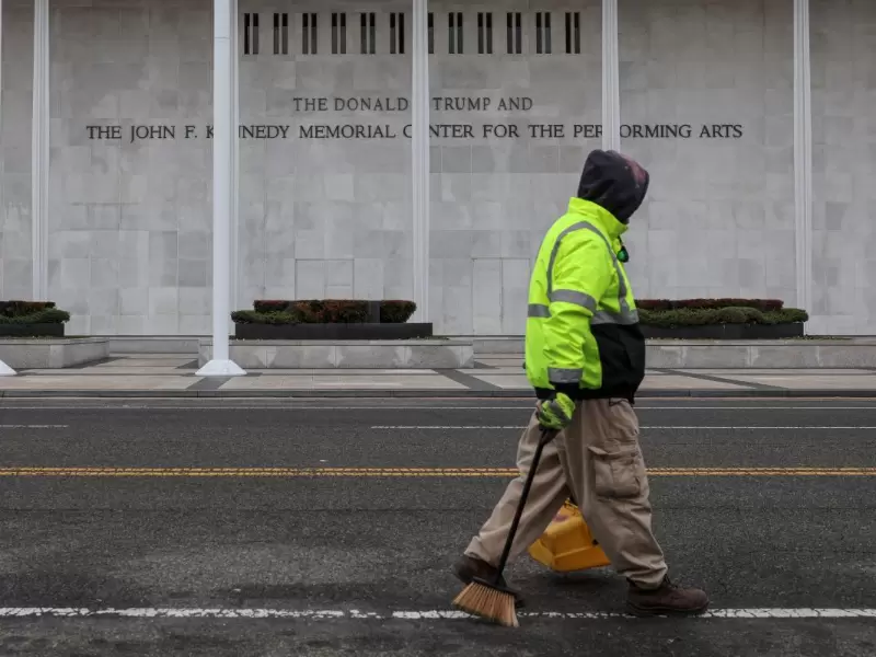 A worker walks in front of the recently renamed Donald J. Trump and John F. Kennedy Memorial Center for the Performing Arts, in Washington, D.C., U.S., December 29, 2025. / REUTERS/Tyrone Siu
