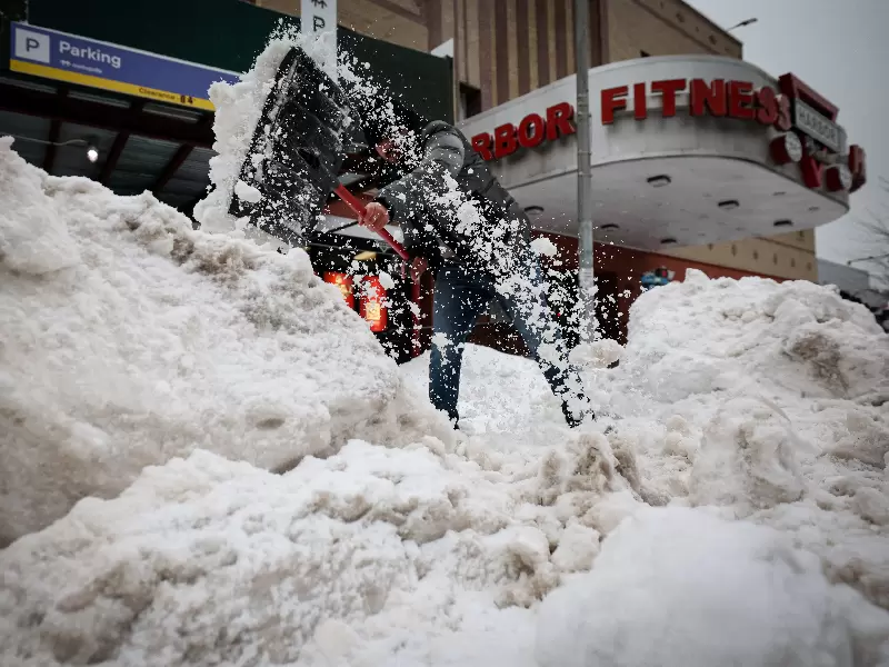 A worker clears snow from the entrance to a parking lot, as a major winter storm spreads across a large swath of the United States, in New York City, U.S., January 26, 2026. / REUTERS/Brendan McDermid