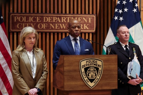 New York City Mayor Eric Adams speaks during a press conference at 1 Police Plaza in New York City, U.S., April 3, 2025. / REUTERS/Jeenah Moon