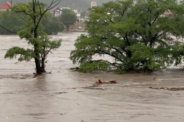 Trees stand partially submerged after storms caused massive flooding from the swollen Guadalupe River in Kerrville, Texas, U.S., July 4, 2025 in this still image from video obtained from social media. / Michael Moad/via REUTERS