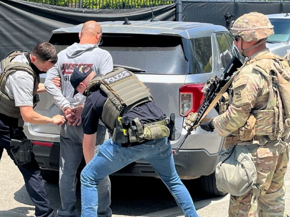 ICE posted photos online on June 10 of National Guard troops standing guard with weapons in hand as ICE officers handcuffed apparent migrants against the side of a car in Los Angeles.