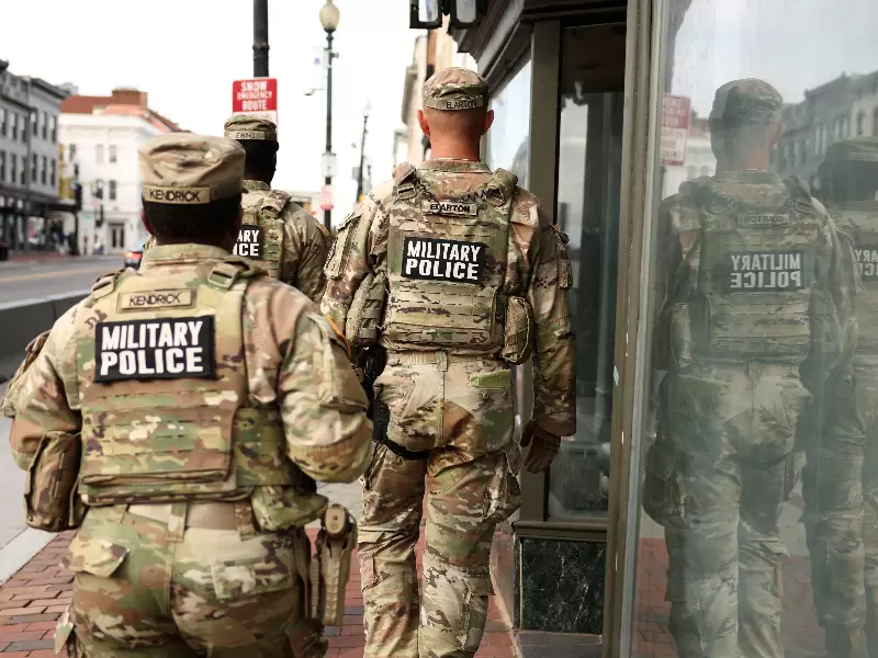 FILE PHOTO: Military police patrol a shopping street in the Georgetown neighborhood of Washington, D.C., U.S., October 29, 2025. / REUTERS/Kevin Lamarque/File Photo