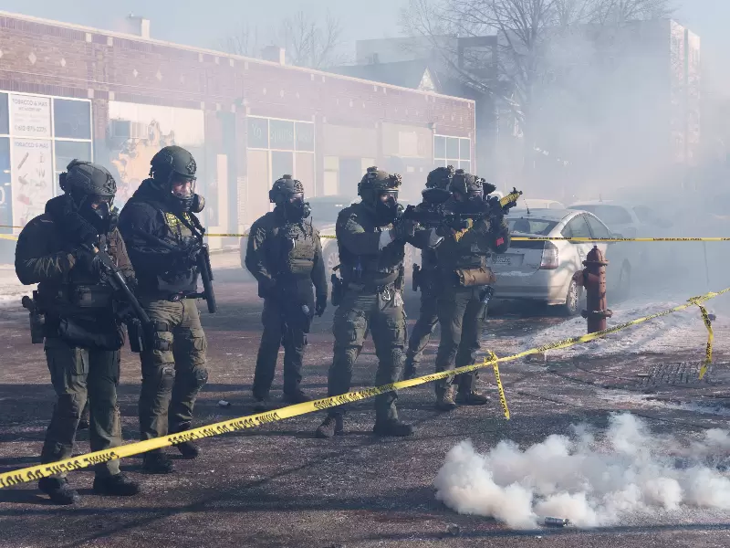 Federal agents fire munitions toward demonstrators near the site where a man identified as Alex Pretti was fatally shot by federal agents trying to detain him, in Minneapolis, Minnesota, U.S., January 24, 2026. / REUTERS/Tim Evans