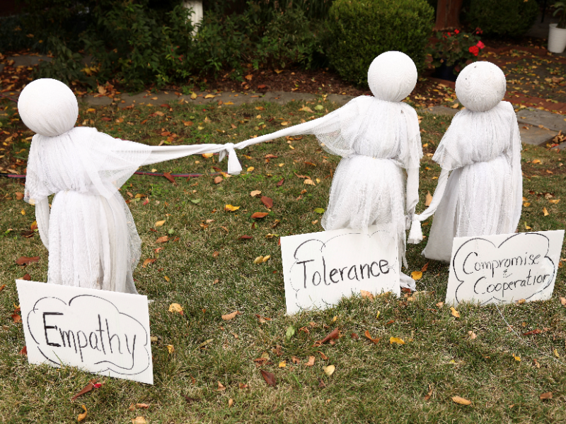 Politically themed Halloween decorations labelled "empathy", "tolerance", and "compromise & cooperation", at the home of Donna Breslin in Washington, D.C., U.S., October 29, 2025. / REUTERS/Kevin Lamarque