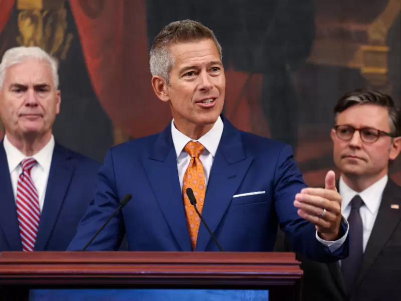 U.S. Transportation Secretary Sean Duffy speaks next to U.S. House Majority Whip Tom Emmer (R-MN) and U.S. House Speaker Mike Johnson (R-LA) during a press conference, weeks into the continuing U.S. government shutdown on Capitol Hill in Washington, D.C., U.S., October 23, 2025. / REUTERS/Kylie Cooper