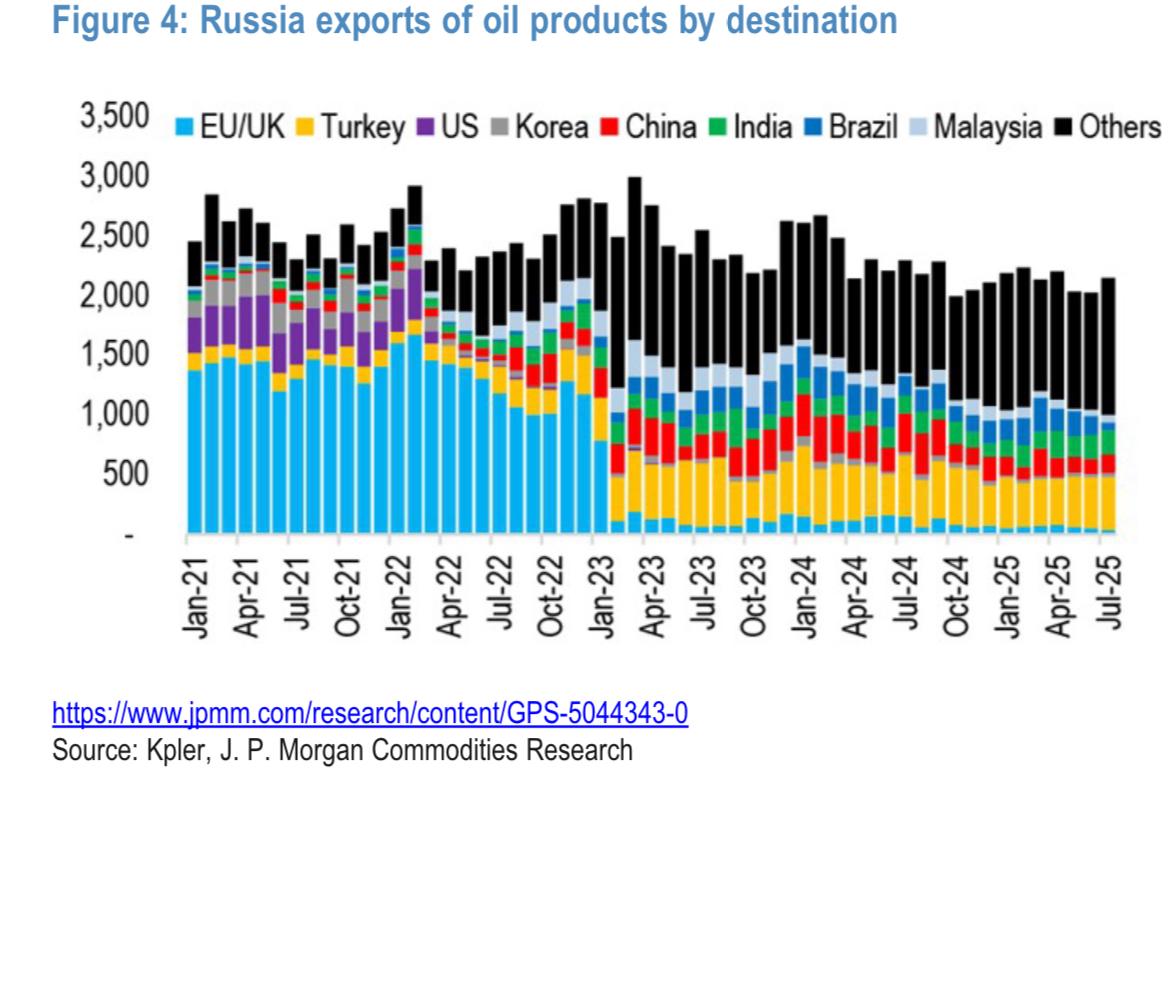 જે.પી. મોર્ગન કોમોડિટીઝ રિસર્ચ અને ઉદ્યોગ સૂત્રોના ડેટા અનુસાર, ડિસેમ્બર 2022થી જુલાઈ 2025 સુધી તુર્કીએ રશિયન રિફાઇન્ડ ઓઇલ ઉત્પાદનોની નિકાસનો 26% હિસ્સો ધરાવ્યો હતો. ચીને 13% અને બ્રાઝિલે 12% હિસ્સો ધરાવ્યો. આ શ્રેણીમાં ભારત ટોચના પાંચ ખરીદદારોમાં નથી.