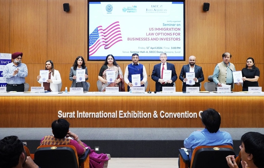 ધી સધર્ન ગુજરાત ચેમ્બર ઓફ કોમર્સ એન્ડ ઈન્ડસ્ટ્રી તથા ઇન્ડો અમેરિકન ચેમ્બર ઓફ કોમર્સના સંયુકત ઉપક્રમે શુક્રવાર, તા. ૧ર એપ્રિલ, ર૦ર૪ના રોજ બપોરે ૩:૦૦ કલાકે સેમિનાર હોલ– એ, સુરત ઇન્ટરનેશનલ એકઝીબીશન એન્ડ કન્વેન્શન સેન્ટર ડોમ, સરસાણા, સુરત ખાતે US Immigration Law options for Businesses and Investors વિષય પર સેમિનારનું આયોજન કરવામાં આવ્યું હતું. જેમાં નિષ્ણાંત વકતાઓ તરીકે Nachman Phulani Zimovcak (NPZ) Law Groupના મેનેજિંગ એટોર્ની ડેવિડ નેચમન, NPZ Law Group, Raritan, New Jersey officeના મેનેજિંગ એટોર્ની સ્નેહલ બત્રા, CMB Swiss COના વાઇસ પ્રેસિડેન્ટ – ભારત ગિરિશ મોહિલે અને CMB Regional Centersના ઇન્વેસ્ટર રિલેશન્સ મેનેજર રંજીતા પ્રકાશ દ્વારા SMEs, MSMEs, HNIs અને પ્રોફેશનલ્સને અમેરિકાના ઇમીગ્રેશન વીઝા વિશે વિસ્તૃત જાણકારી આપવામાં આવી હતી.