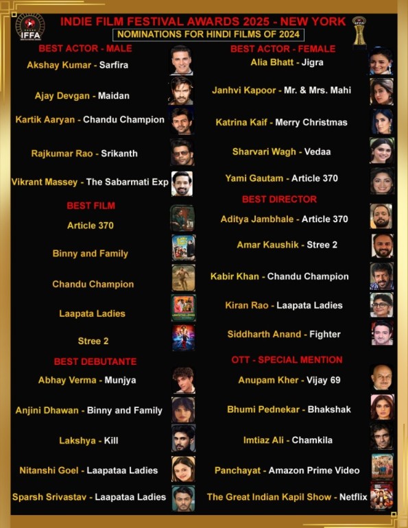 ઇન્ડી ફિલ્મ ફેસ્ટિવલ એવોર્ડ્સ (આઈએફએફએ) એ હોલીવુડ અને બોલિવૂડ બંને સિનેમામાં અસાધારણ સિદ્ધિઓને માન આપતા 2024 માટે તેના નામાંકનની જાહેરાત કરી છે. ન્યુ યોર્ક સિટીના ક્વાડ સિનેમામાં જૂન. 2 થી જૂન. 5 સુધી યોજાનારા પ્રતિષ્ઠિત ફેસ્ટિવલમાં વિશ્વભરના સ્વતંત્ર ફિલ્મ નિર્માતાઓની સર્જનાત્મકતા અને પ્રતિભાની ઉજવણી કરવામાં આવશે.