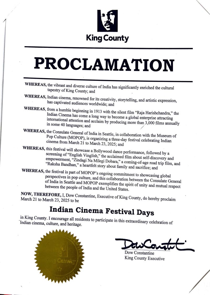 એક્ઝિક્યુટિવ ડાઉ કોન્સ્ટેન્ટાઇન દ્વારા જાહેર કરાયેલી આ માન્યતા સિએટલના કોન્સ્યુલેટ જનરલ ઓફ ઇન્ડિયા અને મ્યુઝિયમ ઓફ પોપ કલ્ચર (MOPOP) દ્વારા સંયુક્ત રીતે આયોજિત ભારતીય સિનેમાના ઉદ્ઘાટન મહોત્સવ સાથે મેળ ખાય છે