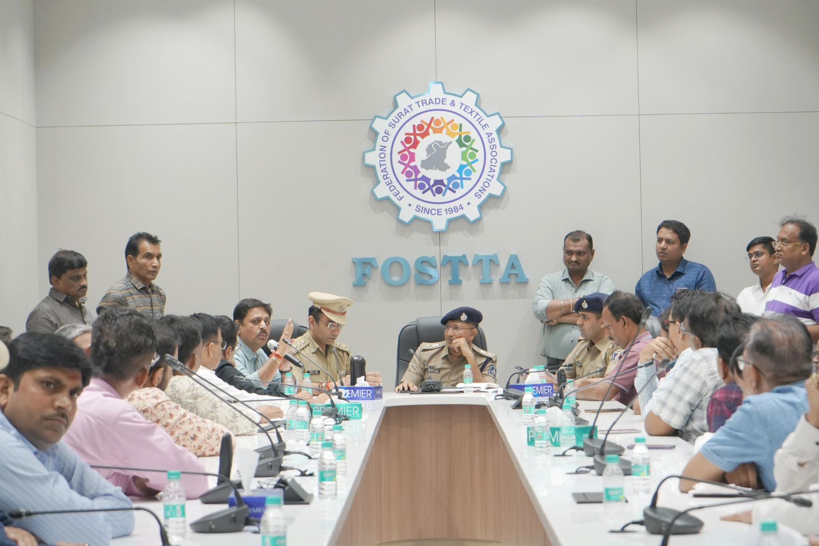 સુરત ટેક્સટાઈલ ટ્રેડર્સ એસોસિએશનની ઓફિસમાં મળેલી બેઠકમાં DCP ભગીરથ ગઢવી, ACP ચિરાગ પટેલ / fosta