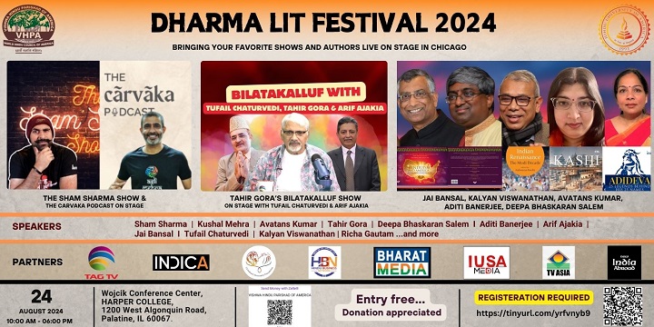 ધર્મ લિટ ફેસ્ટ (ધર્મ લિટરેચર ફેસ્ટિવલ) શનિવાર, 24 ઓગસ્ટના રોજ શિકાગોમાં યોજાશે. આ મહોત્સવમાં સાહિત્યિક અને વ્યવહારુ વિષયો પર રસપ્રદ સંવાદ શ્રેણીનું આયોજન કરવામાં આવશે. વિશ્વ હિન્દુ પરિષદ ઓફ અમેરિકા (વીએચપીએ) દ્વારા સંયુક્ત રીતે આયોજિત આ મહોત્સવ ભારતીય ઉપખંડને આકાર આપવામાં ભારતના જ્ઞાન વારસા અને સાહિત્યની ભૂમિકા તેમજ વૈશ્વિક સંસ્કૃતિ અને વિચાર પર તેની અસરને પ્રકાશિત કરશે.