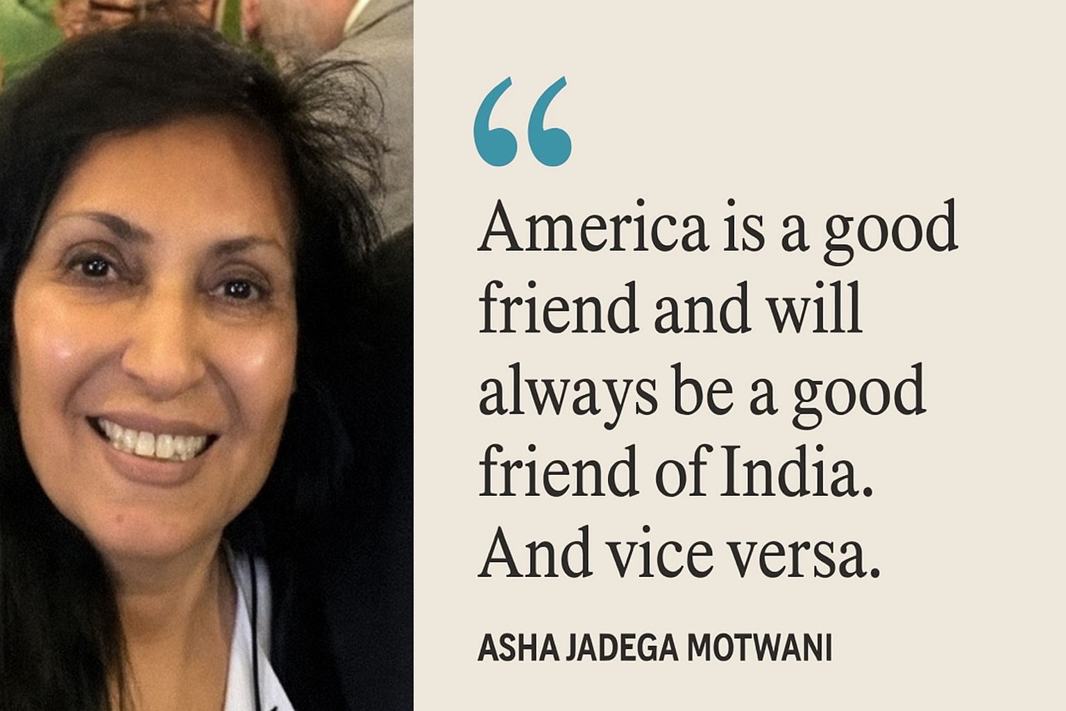 સિલિકોન વેલીના પ્રભાવશાળી વ્યક્તિ અને મોતવાણી જડેજા ફાઉન્ડેશનના સ્થાપક તરીકે, તેઓ લાંબા સમયથી અમેરિકા-ભારત સંબંધો, ખાસ કરીને ટેક્નોલોજી અને શૈક્ષણિક સહયોગમાં નજીકના જોડાણની હિમાયત કરે છે. આ વર્ષની શરૂઆતમાં, તેમણે ભારતને તાકીદથી કાર્યવાહી કરવા જણાવ્યું હતું: “અમેરિકા ભારતને મિત્રતા અને વિશ્વાસ ચાંદીની થાળીમાં ધરી રહ્યું છે.”