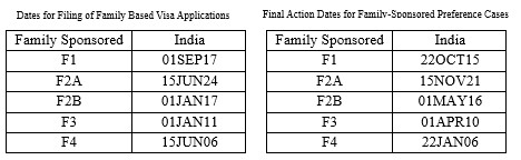 ભારતીય નાગરિકો માટે પરિવાર-પ્રાયોજિત પસંદગીના કેસો / USCIS> ફેમિલી બેઝ્ડ ફર્સ્ટ પ્રેફરન્સ કેટેગરી (F-1-Unmarried Sons and Daughter of U.S. Citizen) માટે વિઝા કટ-ઓફ ડેટ 1 સપ્ટેમ્બર, 2017 રહેશે.