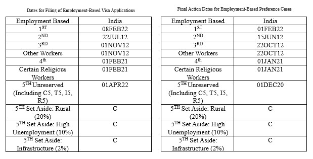 > રોજગાર આધારિત પ્રથમ (પ્રાથમિકતા કામદારો) ભારતનો વિઝા કટ-ઓફ 1 ફેબ્રુઆરી, 2022 ના રોજ સમાન રહે છે.
