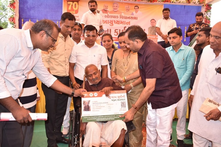 વન, મંત્રી મુકેશભાઈ પટેલે જણાવ્યું હતું કે, સરકાર દ્વારા આયુષ્માન ભા-રત પ્રધાનમંત્રી જન આરોગ્ય યોજના અંતર્ગત ૭૦ વર્ષથી વધુ વયના તમામ વરિષ્ઠ નાગરિકોને સામાજિક, આર્થિક સ્થિતિને ધ્યાનમાં લીધા વગર આયુષ્માન વય વંદના કાર્ડનો લાભ આપી પીએમજેવાય યોજના સંલગ્ન હોસ્પિટલોમાં સારવાર મેળવી શકે તે માટે આધારકાર્ડથી એનરોલમેન્ટ કરી આયુષ્માન વય વંદના કાર્ડ ઇસ્યુ કરવામાં આવે છે. જેનો લાભ મેળવવા આવેલા વડીલોને વંદન કરી તેમણે આ યોજનાનો વધુમાં વધુ લાભ મેળવવા અનુરોધ કર્યો હતો.
