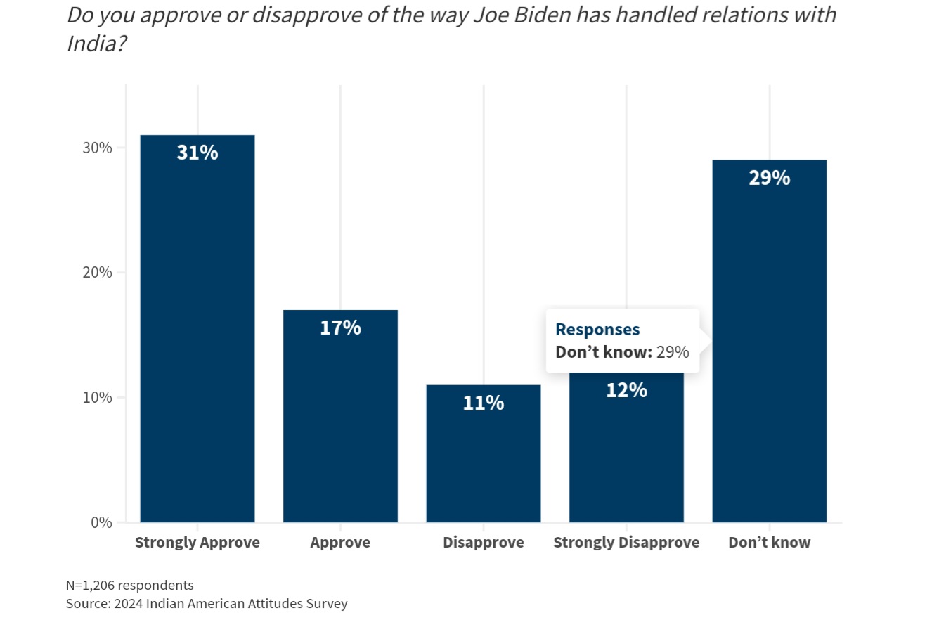 'ફોરેન પોલિસી એટીટ્યુડ્સ ઓફ ઇન્ડિયન અમેરિકન્સઃ 2024 સર્વે રિઝલ્ટ્સ "શીર્ષક હેઠળના સર્વેમાં જાણવા મળ્યું છે કે 48 ટકા ઉત્તરદાતાઓ બિડેનના અમેરિકા-ભારત સંબંધોના સંચાલનને મંજૂરી આપે છે, જ્યારે 33 ટકા લોકોએ તેમના પ્રથમ કાર્યકાળના અંતે ટ્રમ્પના અભિગમને મંજૂરી આપી હતી. જ્યારે પૂછવામાં આવ્યું કે કયા રાષ્ટ્રપતિ અમેરિકા-ભારત સંબંધોને વધુ સારી રીતે સંભાળે છે, ત્યારે 34 ટકા ઉત્તરદાતાઓએ બિડેનનું નામ લીધું, જ્યારે 28 ટકા લોકોએ ટ્રમ્પને પસંદ કર્યું. નોંધપાત્ર ભાગ, 26 ટકા, એવું અનુભવે છે કે બંનેએ લગભગ સમાન પ્રદર્શન કર્યું છે.