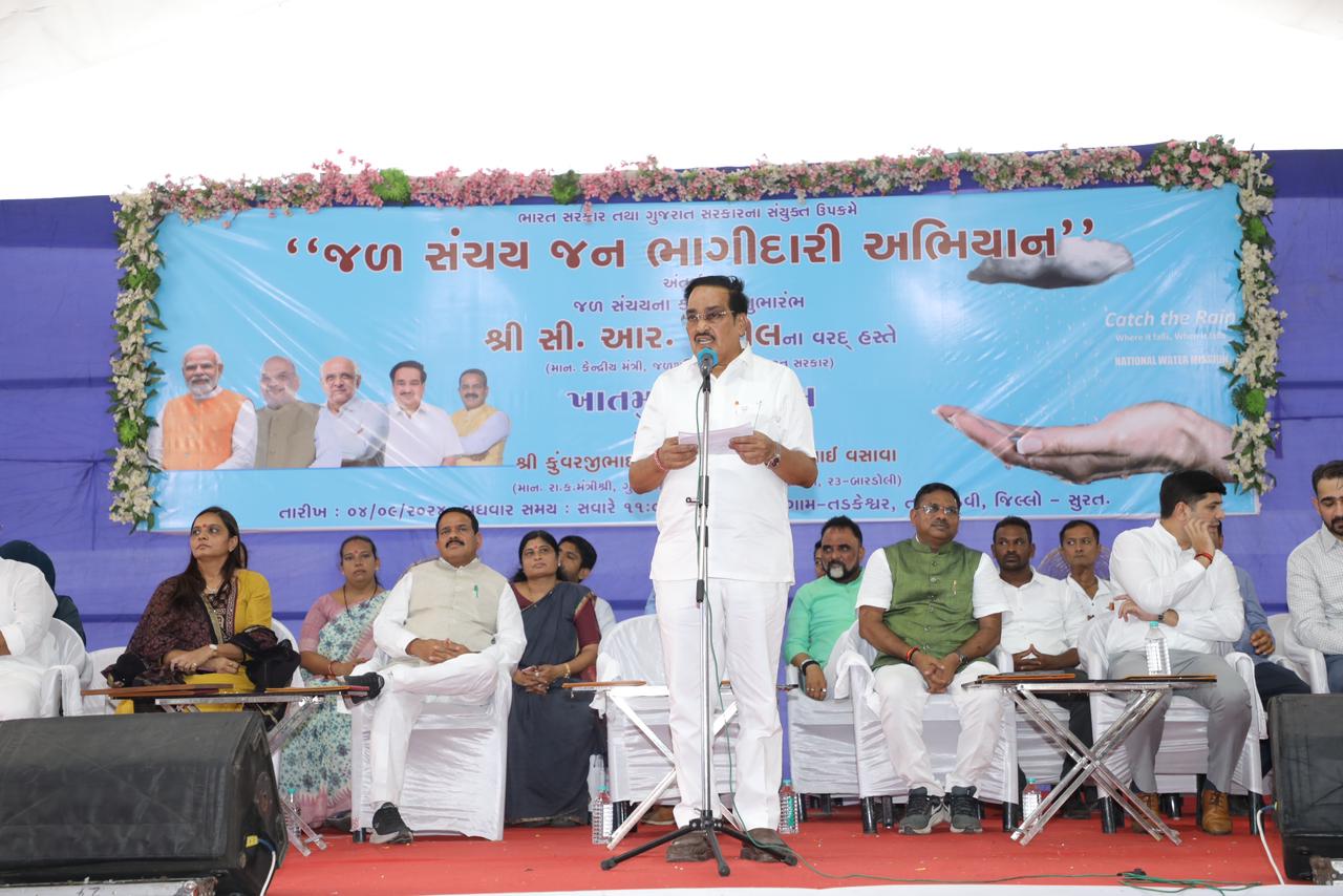 આ પ્રસંગે કેન્દ્રીય જળશક્તિ મંત્રીશ્રીએ જળસંચય અભિયાન હેઠળ પાણીરૂપી પારસમણિને સંગ્રહ કરવાના કાર્યનો પ્રારંભ પ્રથમ સુરત જિલ્લામાંથી થઇ રહ્યો છે જે ગુજરાત સહિત સમગ્ર ભારતમાં મોટુ જનઅભિયાન બનશે એમ જણાવી 'જળસંચય અને જનભાગીદારી' હેઠળ જિલ્લાના બિનઉપયોગી અને બંધ ખાનગી ટ્યુબવેલને વરસાદી પાણીથી રિચાર્જ કરી ફરી તે જ પાણીનો ઉપયોગ કરવાનો અનુરોધ કર્યો હતો.