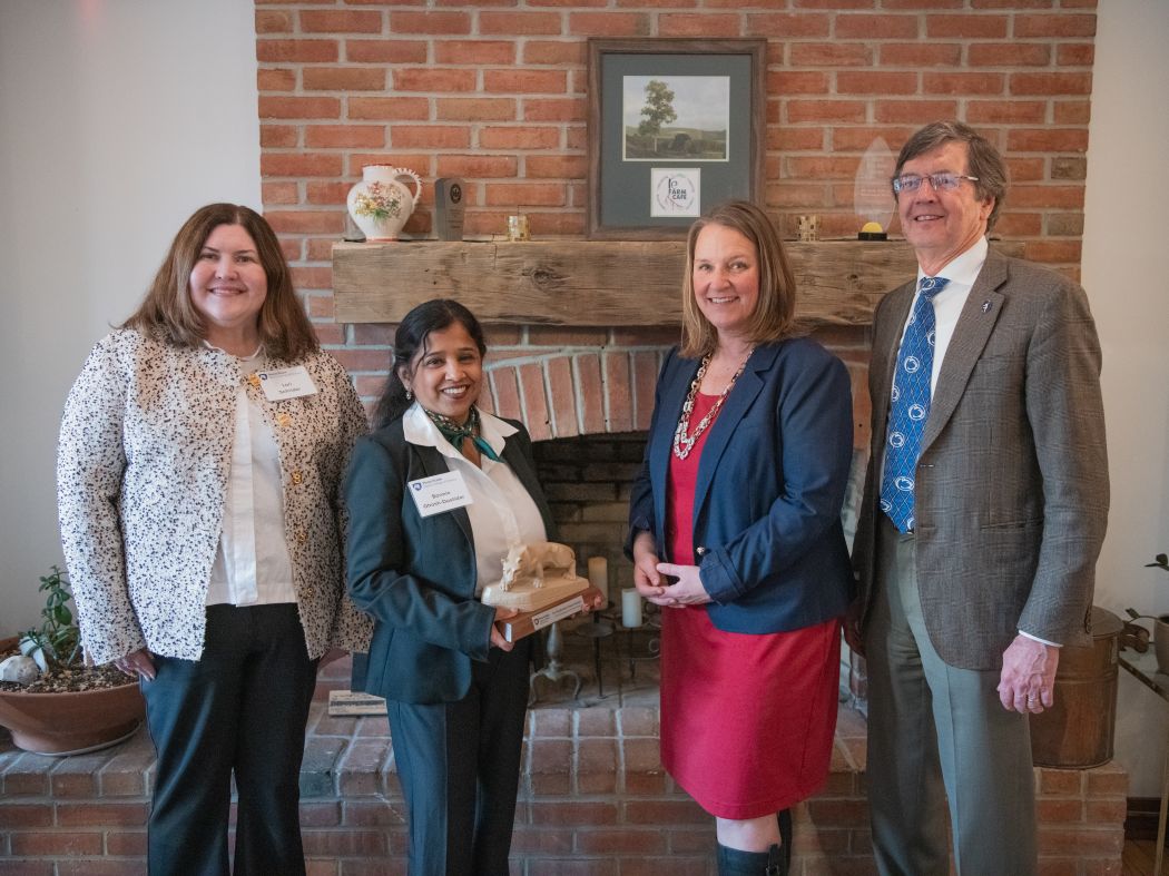 ડાબેથી જમણેઃ લોરી શ્રીડર, એલ્યુમ્ની સોસાયટી બોર્ડના પ્રમુખ, મધુમિતા ઘોષ-દસ્તીદાર, આઉટસ્ટેન્ડિંગ સાયન્સ એલ્યુમ્ની એવોર્ડ મેળવનાર, મેરી બેથ વિલિયમ્સ, પેન સ્ટેટ એબરલી કોલેજ ઓફ સાયન્સના કાર્યકારી ડીન અને થોમસ ગાર્ડનર, આઉટસ્ટેન્ડિંગ સાયન્સ એલ્યુમ્ની એવોર્ડ મેળવનાર. / Penn State. Creative Commons