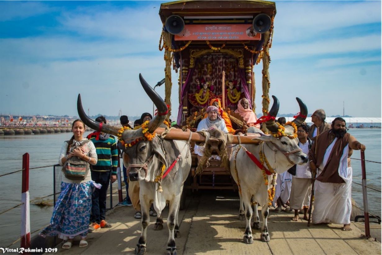 ઇસ્કોન શિબિરના આયોજક સનાતન દાસ ગૌરા નિતાઈ અને શ્રીલા પ્રભુપાદને લઈ જતી બળદગાડી ખેંચે છે. / Ritu Marwah
