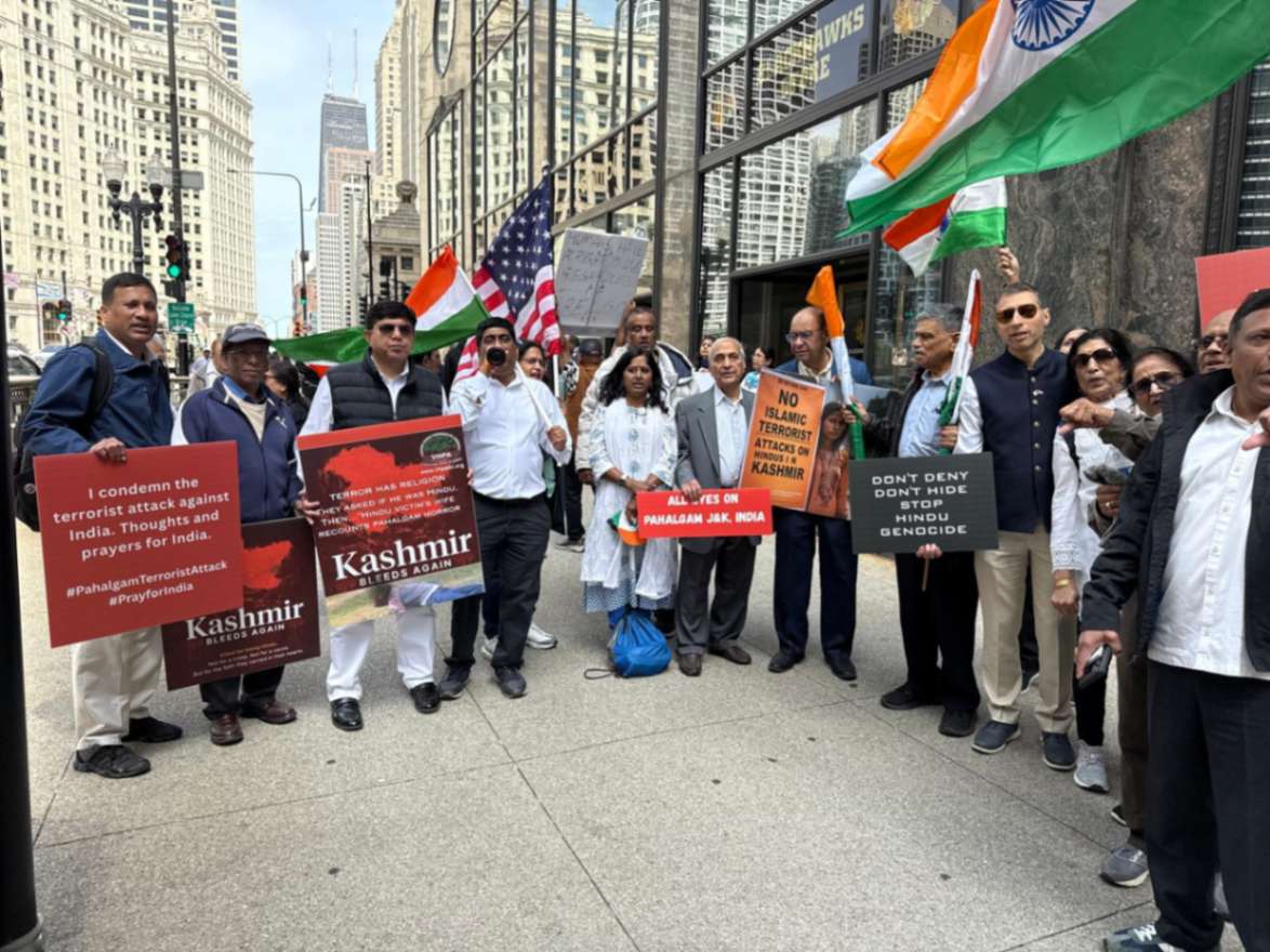 ઇલિનોઇસ, ઇન્ડિયાના અને વિસ્કોન્સિનના સેંકડો ભારતીય અમેરિકનો એપ્રિલમાં શિકાગોમાં પાકિસ્તાની વાણિજ્ય દૂતાવાસની બહાર એકઠા થયા હતા. 28 એપ્રિલના રોજ કાશ્મીરના પહેલગામમાં નિર્દોષ પ્રવાસીઓ પર પાકિસ્તાની આતંકવાદીઓ દ્વારા કરવામાં આવેલા ક્રૂર આતંકવાદી હુમલાનો વિરોધ કરવા માટે. 22 છે.