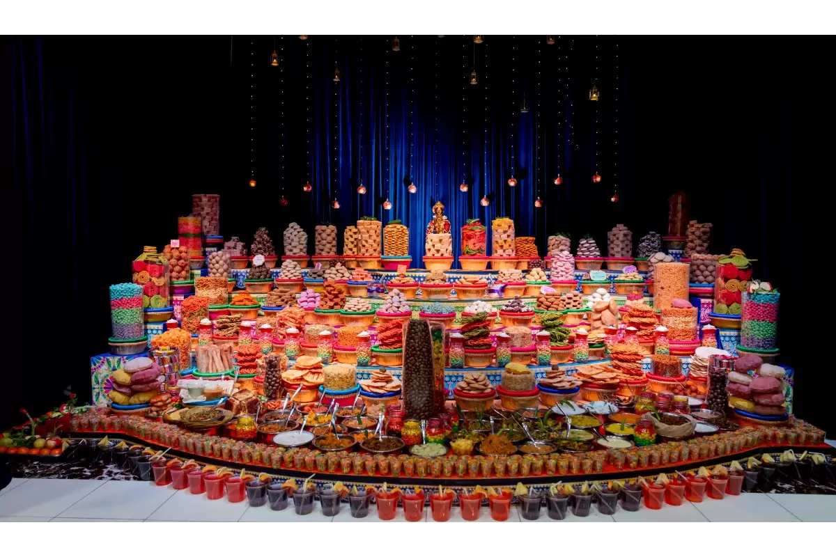 ઉજવણીનો મુખ્ય ભાગ હતો અન્નકૂટ, એટલે કે “ભોજનનો પર્વત”, જે એક ભક્તિભાવનું અર્પણ છે, જેમાં સેંકડો શાકાહારી વાનગીઓ તૈયાર કરીને પ્રાર્થનાના ભાગ રૂપે ગોઠવવામાં આવી હતી. આ અર્પણ કૃતજ્ઞતા અને ભક્તિનું પ્રતીક છે.