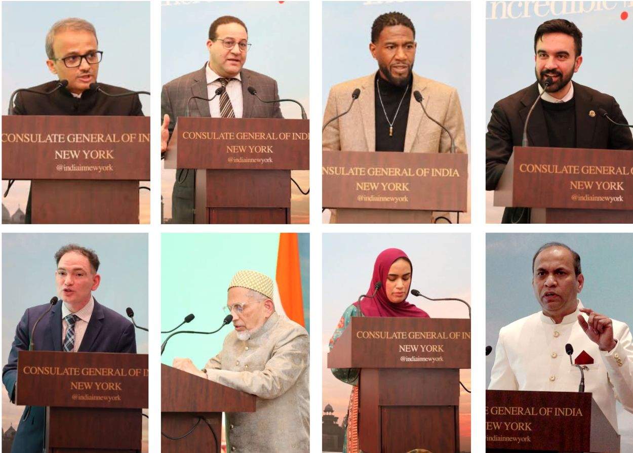કાર્યક્રમના વક્તાઓ, ડાબેથી જમણેઃ ભારતના કોન્સ્યુલ જનરલ બિનયા પ્રધાન; મોરોક્કો સામ્રાજ્યના કોન્સ્યુલ જનરલ, અબ્દેલકાદર જામોસી; એનવાયસી પબ્લિક એડવોકેટ જુમાને વિલિયમ્સ; એનવાયએસ એસેમ્બલીના સભ્ય જોહરાન મમદાની; એનવાયસી મેયર ઓફિસના ડેપ્યુટી કમિશનર, દિલીપ ચૌહાણ; આઇએમએનએ સહ-અધ્યક્ષ અહમદ શાકિર; યુવાન વ્યાવસાયિક નિમરા ફાતિમા; અને આઇએમએનએ અધ્યક્ષ ઈલયાસ કુરેશી. / IMNA