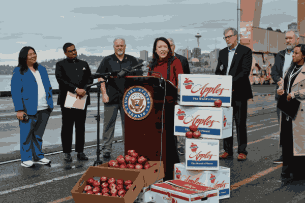 યુ.એસ. સેનેટર મારિયા કેન્ટવેલે સેન્ટ્રલ વોશિંગ્ટનના સફરજન ઉત્પાદકો અને શ્રમ અને બંદર અધિકારીઓની સાથે સિએટલમાં નવા ખુલેલા ભારતીય કોન્સ્યુલેટના કોન્સલ જનરલ પ્રકાશ ગુપ્તા સાથે પ્રેસ કોન્ફરન્સમાં ભાગ લીધો હતો. તેઓ અત્યંત સફળ સફરજન શિપિંગ સીઝનની ઉજવણી કરવા માટે એકઠા થયા હતા, જે ભારતે અમેરિકન-ઉગાડેલા સફરજન પર તેના 20 ટકા પ્રતિભાવાત્મક ટેરિફને ઘટાડ્યા પછી પ્રથમ સિઝનને ચિહ્નિત કરે છે.