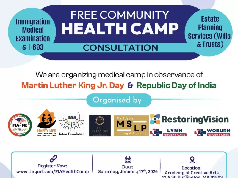 ફાઉન્ડેશન ઓફ ઇન્ડિયન-અમેરિકન્સ (FIA) – ન્યૂ ઇંગ્લેન્ડ તરફથી તેના બિન-લાભકારી તેમજ હેલ્થકેર પાર્ટનર્સ સાથે સંયુક્ત રીતે 17 જાન્યુઆરીના રોજ બર્લિંગ્ટન, એમએ 01803 ખાતેની એકેડમી ઓફ ક્રિએટિવ આર્ટ્સ, 12 A સ્ટ્રીટ પર સવારે 10:00 વાગ્યાથી નિઃશુલ્ક કોમ્યુનિટી હેલ્થ કેમ્પનું આયોજન કરવામાં આવી રહ્યું છે.