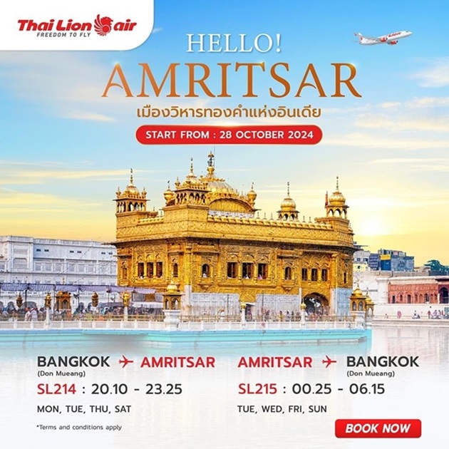 ભારતમાં પવિત્ર શહેર અમૃતસર હવે બેંગકોકના ડોન મુઆંગ આંતરરાષ્ટ્રીય વિમાનમથક (ડીએમકે) સાથે સીધું જોડાયેલું છે. થાઈ લાયન એરએ 28 ઓક્ટોબર, 2024 થી બંને શહેરો વચ્ચે સીધી ફ્લાઇટ્સ શરૂ કરવાની જાહેરાત કરી છે. ફ્લાય અમૃતસર પહેલ દ્વારા આ નિર્ણયને આવકારવામાં આવ્યો છે.