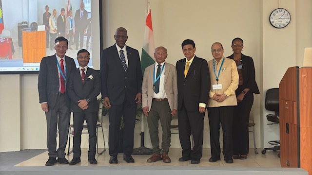 કાર્યક્રમમાં ઉપસ્થિત લોકો અને મહેમાનો. (ડાબેથી જમણે) ડૉ. અનુપમ સિબ્બલ, ભૂતપૂર્વ પ્રમુખ, GAPIO. ડૉ. અમીર તેલાંગ, ગયાના, એન્ટિગુઆ બારબુડા સેન્ટ કિટ્સ એન્ડ નેવિસમાં ભારતના ઉચ્ચાયુક્ત, રોડની વિલિયમ્સ, એન્ટિગુઆ અને બારબુડાના ગવર્નર જનરલ, ડૉ. નંદકુમાર જયરામ, પ્રમુખ, જીએપીઆઈઓ, ડૉ. સુધીર પારિખ, ઉપાધ્યક્ષ, જીએપીઆઈઓ, ડૉ. પવન કપૂર, એર માર્શલ (નિવૃત્ત) અને ડૉ. લેસ્લી વાલ્વિન, એસોસિયેટ ડીન, અમેરિકન યુનિવર્સિટી ઓફ એન્ટિગુઆ કોલેજ ઓફ મેડિસિન. / GAPIO
