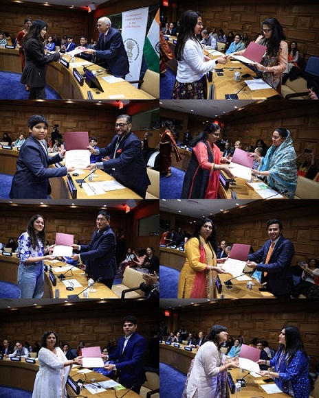 આ પ્રસંગે હિન્દીમાં નિબંધ લેખન, કવિતા અને ગાયન સ્પર્ધાઓના વિજેતાઓને સન્માનિત કરવામાં આવ્યા હતા. / UN Mission, India