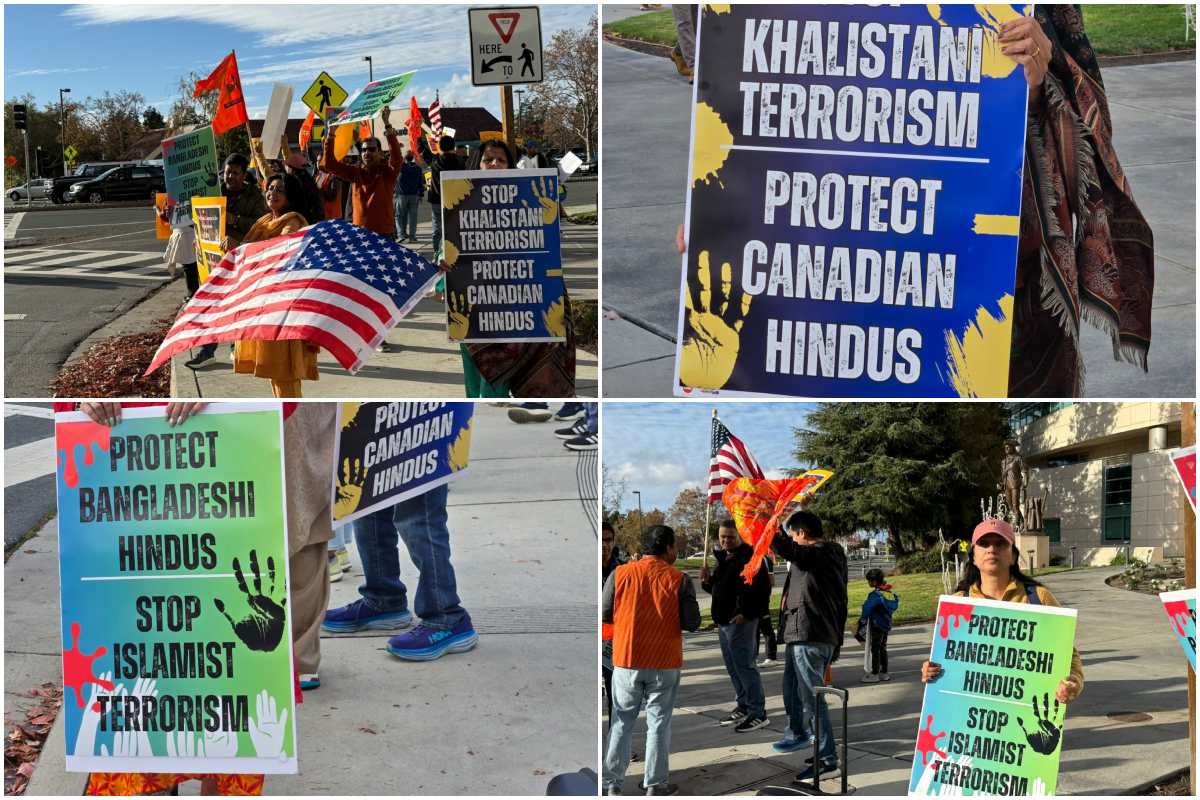 કેલિફોર્નિયાના બે એરિયામાં હિન્દુ સમુદાયના સભ્યો તે દેશોમાં ઉગ્રવાદી તત્વો દ્વારા કેનેડિયન અને બાંગ્લાદેશી હિંદુઓ સામે ચાલી રહેલા અત્યાચારોને પ્રકાશિત કરવા માટે એકઠા થયા છે. / Courtesy Photo