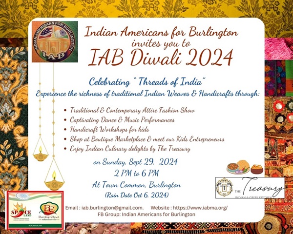 આ વર્ષે, દિવાળીની ઉજવણી પેહલા ક્યારેય ન કરી હોય તે રીતે કરવામાં આવશે. કારણ કે બર્લિંગ્ટન માટે ભારતીય અમેરિકનો (IAB) રવિવાર, 29 સપ્ટેમ્બર, 2024 ના રોજ બર્લિંગ્ટન કોમન્સ ખાતે "થ્રેડ્સ ઓફ ઇન્ડિયા" ની થીમ પર વિશેષ દિવાળીની ઉજવણીનું આયોજન કરાયું છે.