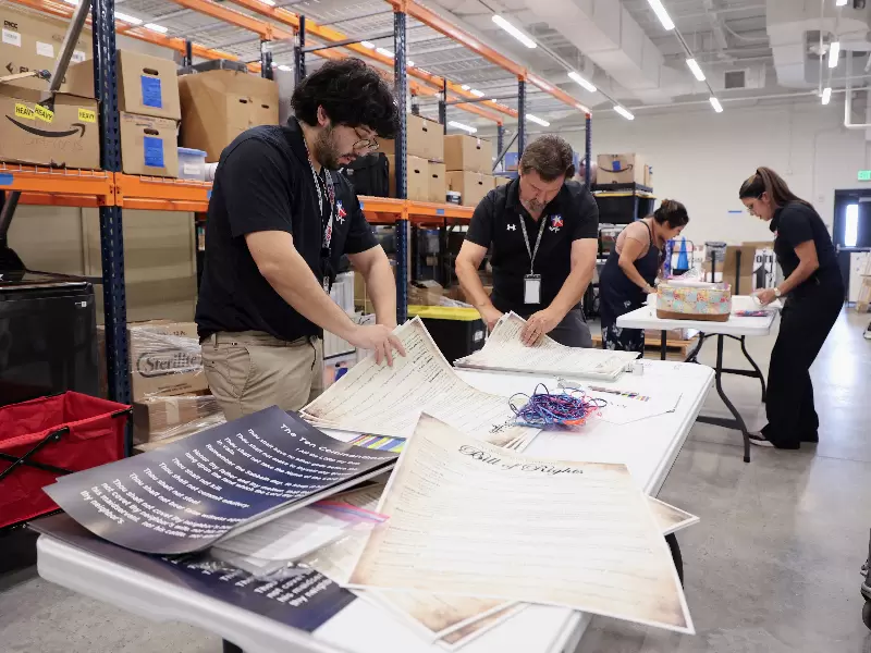૧૬ સપ્ટેમ્બર, ૨૦૨૫ના રોજ, ટેક્સાસ, યુ.એસ.ના કાયલમાં હેય્સ કોન્સોલિડેટેડ ઇન્ડિપેન્ડન્ટ સ્કૂલ ડિસ્ટ્રિક્ટના કર્મચારીઓ બિલ ઓફ રાઇટ્સ પોસ્ટરો તૈયાર કરી રહ્યા છે. / Reuters