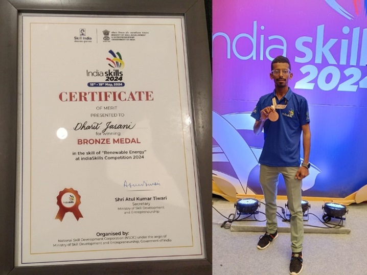 ભારતના યુવાઓની કલ્પનાશક્તિ તથા દક્ષતામાં વધારો થાય તેમજ યુવાઓને કૌશલ્ય ક્ષેત્રે નવી ઉડાન મળે એવા આશયથી દર બે વર્ષે ઇન્ડિયા લેવલે India Skills સ્પર્ધાનું આયોજન કરવામાં આવે છે. તાજેતરમાં નવી દિલ્હી ખાતે યોજાયેલ ‘India skills-૨૦૨૪’ સ્પર્ધામાં મજુરાગેટ આઈ.ટી.આઈ.માં અભ્યાસ કરતા સોલાર ટેકનિશીયન ટ્રેડના તાલીમાર્થી ધારિત જસાણીએ સુપરવાઈઝર ઈન્સ્ટ્રકટર શ્રી જી.કે.જરીવાલાના માર્ગદર્શન હેઠળ રિન્યુએબલ એનર્જી સ્કીલ સ્પર્ધામાં ભાગ લઈ સમગ્ર દેશમાં ત્રીજો ક્રમ પ્રાપ્ત કરી બ્રોન્ઝ મેડલ મેળવી સુરત સહિત સમગ્ર રાજ્યનું નામ રોશન કર્યું છે.