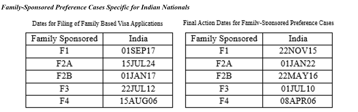> ભારત માટે પરિવાર આધારિત બીજી પસંદગીની શ્રેણી (F2A-કાયમી રહેવાસીઓની પત્નીઓ અને બાળકો) વિઝા કટ-ઓફ તારીખ પણ 15 જુલાઈ 2024 છે.