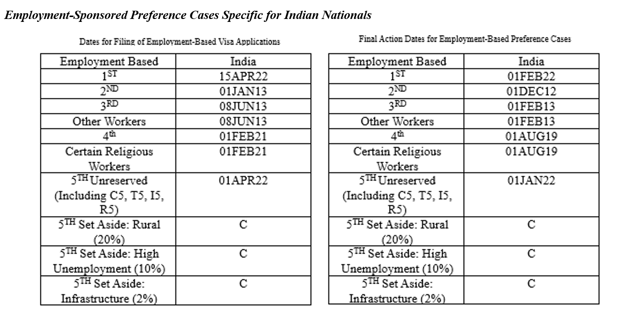 > 1 જાન્યુઆરી 2022 સુધીમાં રોજગાર આધારિત પાંચમા (રોજગાર સર્જન-જે ઇબી-5 ઇમિગ્રન્ટ ઇન્વેસ્ટર વિઝા કેટેગરી છે) ઇબી 5 વિઝા ઉપલબ્ધતાની સ્થિતિમાં ભારત માટે અનામત શ્રેણી.  અંતે, EB5 માટે વિઝા નંબર (જે ગ્રામીણ અને ઉચ્ચ બેરોજગારી અને માળખાગત ક્ષેત્રોને આવરી લે છે) અંતિમ કાર્યવાહીની તારીખોમાં ભારતમાં જન્મેલા અરજદારોનો ચાર્ટ 'વર્તમાન' રહેશે.