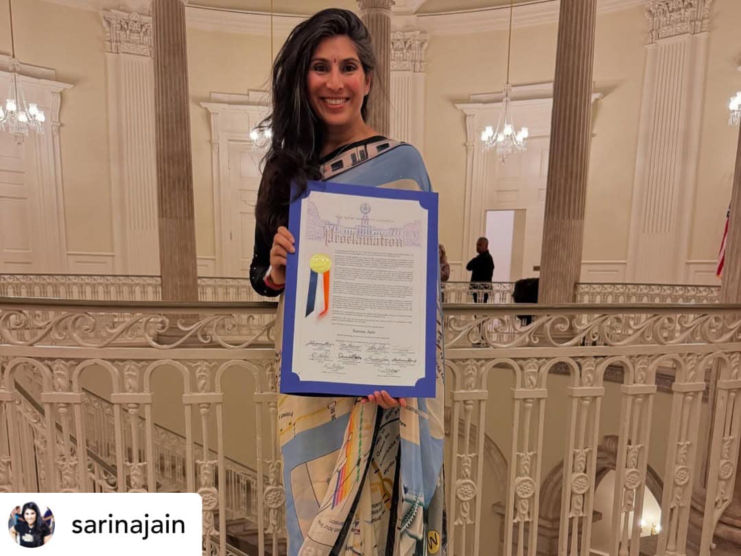સરીના જૈનને છેલ્લા 25 વર્ષોમાં તેમની ઉત્કૃષ્ટ સેવા માટે ન્યુ યોર્ક સિટી મેયરની આંતરરાષ્ટ્રીય બાબતોની કચેરી દ્વારા માન્યતા આપવામાં આવી હતી.