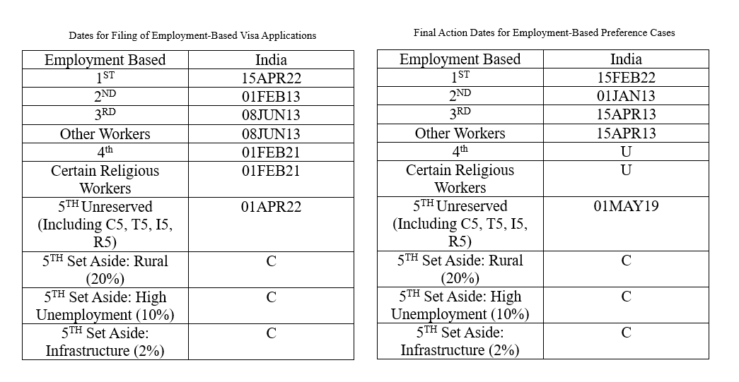 "Final Action Dates" ચાર્ટ દર્શાવે છે કે કયા દિવસથી વિઝા અપાવવામાં આવવા લાગશે, જ્યારે "Dates for Filing Applications" ચાર્ટ બતાવે છે કે અરજદારો ક્યારે અરજી કરવાનું પ્રારંભ કરી શકે છે.