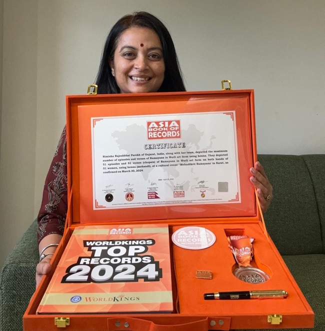 સુરતના યુવાઓ, મહિલાઓ પોતાની પ્રતિભાના દમ પર સુરત, ગુજરાત અને ભારત દેશનું નામ રોશન કરી રહ્યા છે. આવા પ્રતિભાશાળી વ્યક્તિઓમાં નિમિષા પારેખનું નામ પણ સામેલ થયું છે. મહેંદી કલ્ચરના સ્થાપક અને દેશ-વિદેશમાં જાણીતા મહેંદી આર્ટિસ્ટ નિમિષા પારેખ દ્વારા રચિત "મહેંદીકૃત રામાયણ" ને એશિયા બુક ઓફ રેકોર્ડ્સમાં સ્થાન મળ્યું છે. આ ઉત્કૃષ્ઠ આર્ટ માટે તેમને પ્રમાણપત્ર એનાયત થયું છે. ઉલ્લેખનીય છે કે, નિમિષાબેન અને તેમની ટીમે રામાયણની વિવિધ 51 ચોપાઈઓ પર આધારિત 51 જેટલાં પ્રસંગોને વારલી આર્ટમાં મહેંદી સ્વરૂપે સુરતની 51 બહેનોના હાથ પર રજૂ કર્યાં હતા, જેણે સૌનું ધ્યાન આકર્ષિત કર્યું હતું.