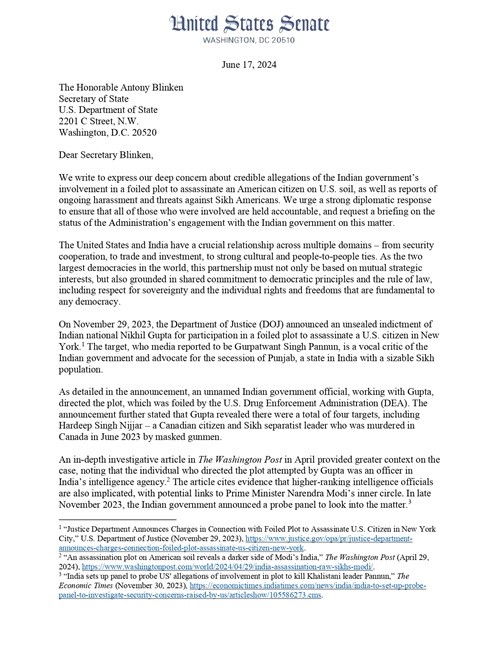 અમેરિકામાં ડેમોક્રેટિક સેનેટર્સે જૂન.17 ના રોજ યુએસ સેક્રેટરી ઓફ સ્ટેટ એન્થોની બ્લિંકનને પત્ર લખીને યુએસની ધરતી પર એક શીખ અલગતાવાદીની હત્યાના નિષ્ફળ કાવતરામાં ભારત સરકારની સંડોવણીના આરોપો અંગે ચિંતા વ્યક્ત કરી હતી. આ પત્ર પર સેનેટર જેફ મર્કલી, રોન વાયડેન, ટિમ કેન, બર્ની સેન્ડર્સ અને ક્રિસ વાન હોલેન દ્વારા હસ્તાક્ષર કરવામાં આવ્યા હતા.