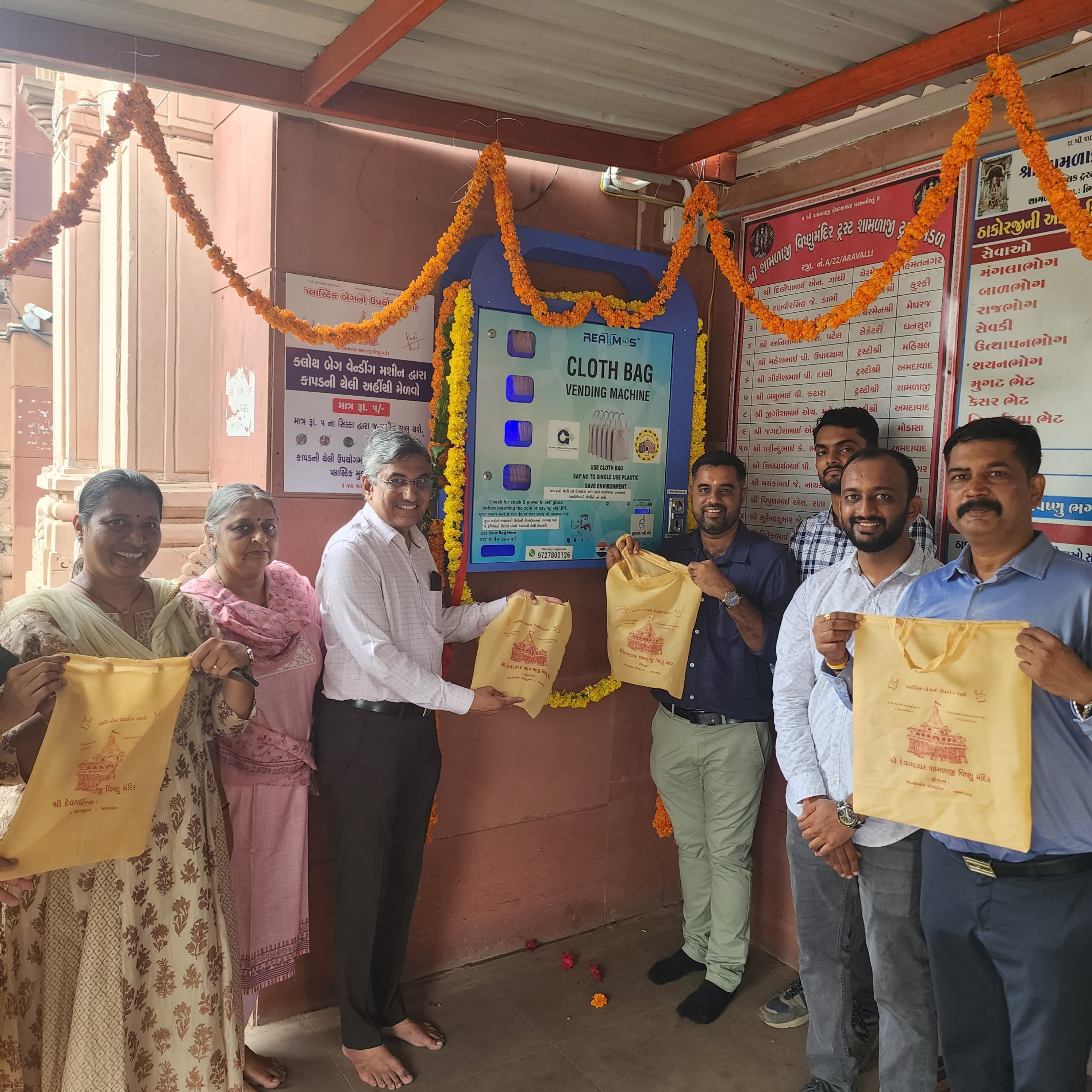 અત્યારે રાજ્યના મહત્વના મંદિરો જેમ કે અંબાજી , સોમનાથ, દ્વારકા, શામળાજી, સાળંગપુર, તથા ઇસ્કોન મંદિર પર 14 મશીન મુકવામાં આવ્યા છે. અહીં આવતા શ્રદ્ધાળુઓને હવે કાપડની થેલીમાં જ પ્રસાદ મળી રહે છે. આ મશીનમાં પાંચ રૂપિયાનો સિક્કો નાખીને અથવા તો QR કોડ સ્કેન કરીને થેલી મેળવી શકાય છે. મંદિરે દર્શનાર્થે આવતા ભાવિકો તરફથી આ પહેલ અંગે સારો પ્રદિસાદ મળી રહ્યો છે અને 60 દિવસમાં 5 હજારથી વધુ થેલીઓનું વિતરણ કરવામાં આવ્યું છે. આ પહેલને વધુ આગળ લઇ જવા માટે આગામી એક મહિનામાં અમુલ પાર્લરના 250 આઉટલેટ પર આ પ્રકારના મશીન મુકવામાં આવશે. આ બાબતે ગુજરાત પ્રદુષણ નિયંત્રણ બોર્ડના અધ્યક્ષ આર.બી.બારડે જણાવ્યું હતું કે “રાજ્યમાં પ્લાસ્ટિકની થેલીનો ઉપયોગ બંધ થાય અને કાપડની થેલીનો ઉપયોગ વધુ થાય તે હેતુથી ખરીદીના સ્થળ પર જ એટીએમ મશીન લગાડવામાં આવ્યા છે જેથી વધુમાં વધુ લોકો લાભ લઇ શકે”.