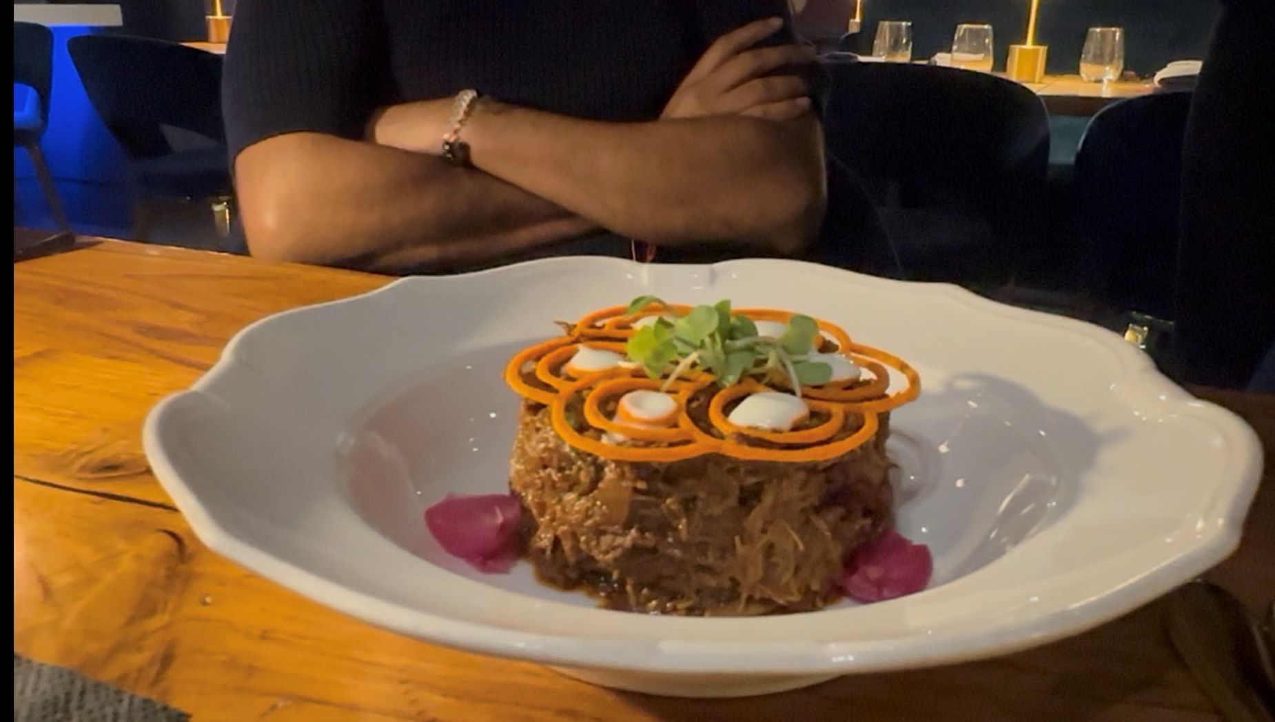 શેફ વેલિસ સ્વાદ અને સૌંદર્યનો અનોખો સંગમ રચે છે. તેમનું બ્રાન્ઝિનો ફિશ, જે ક્રીમી ડિલ કરી પર તરે છે, તેને જાપાની ફોમની નાજુક સજાવટથી શણગારવામાં આવે છે, જ્યારે મશરૂમ અને વોટર ચેસ્ટનટ હેશ પર પાતળી દોસાનું ‘મોહૉક’ શૈલીમાં રજૂ થાય છે.