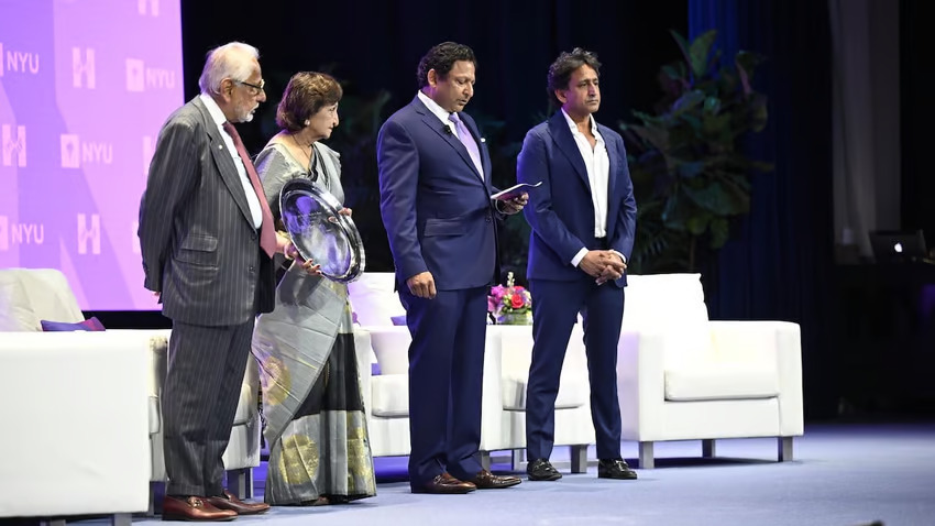 ડાબી બાજુથી શાહ પરિવારઃ હસુ, હર્ષા, જય અને નીલ 2024 NYU IHIIC ખાતે મંચ પર. / Questex/Matt Rickman