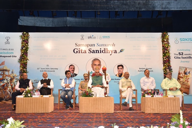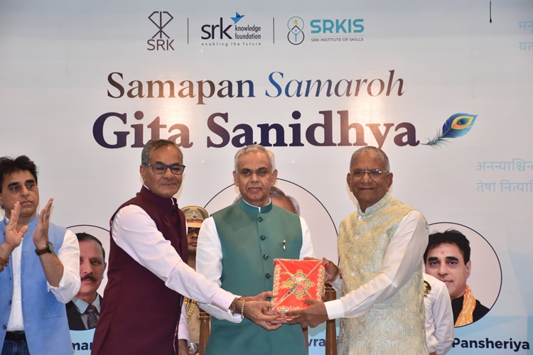 SRK નોલેજ ફાઉન્ડેશન-સુરત દ્વારા SRK ઈન્સ્ટિટ્યૂટ ઓફ સ્કીલ્સ અને નર્મદ યુનિવર્સિટીના સેન્ટર ફોર સોશ્યલ સ્ટડીઝના સંયુક્ત ઉપક્રમે છેલ્લા એક વર્ષથી સતત બાવન સપ્તાહ સુધી અવિરતપણે ચાલતી ગીતા જ્ઞાન પીરસતી વ્યાખ્યાન માળાનો સમાપન સમારોહ રાજ્યપાલશ્રી આચાર્ય દેવવ્રતજી અને શિક્ષણ રાજ્યમંત્રીશ્રી પ્રફુલભાઈ પાનશેરિયાની પ્રેરક ઉપસ્થિતિમાં યોજાયો હતો.
