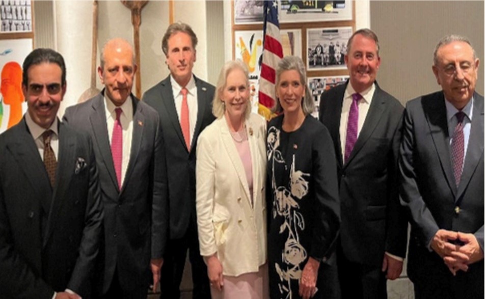 L to R: Youseff Amrani, Ambassador of Morrocco; Sir Liam Fox, Abraham Accords, UK; Senator Joni Ernst (R-IA); Senator Kristen Gillibrand (D-NY); Allen Bird, Abraham Accords Prosperity Group; Arthur Kapoor, Chairman, American Hindu Jewish Congress, Ambassador Shaikh Abdulla Al Khalifa, Kingdom of Bahrain / American Hindu Jewish Congress